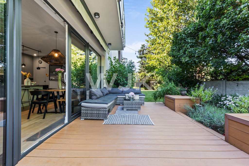 Zadbany ogród oraz duży taras tworzą idealną przestrzeń do relaksu i wypoczynku.