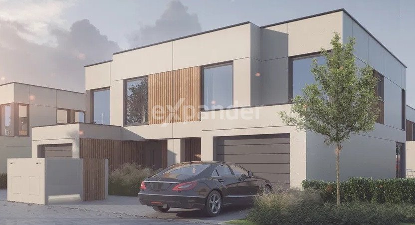 Budynek w zabudowie bliźniaczej, piętrowy z garażem.