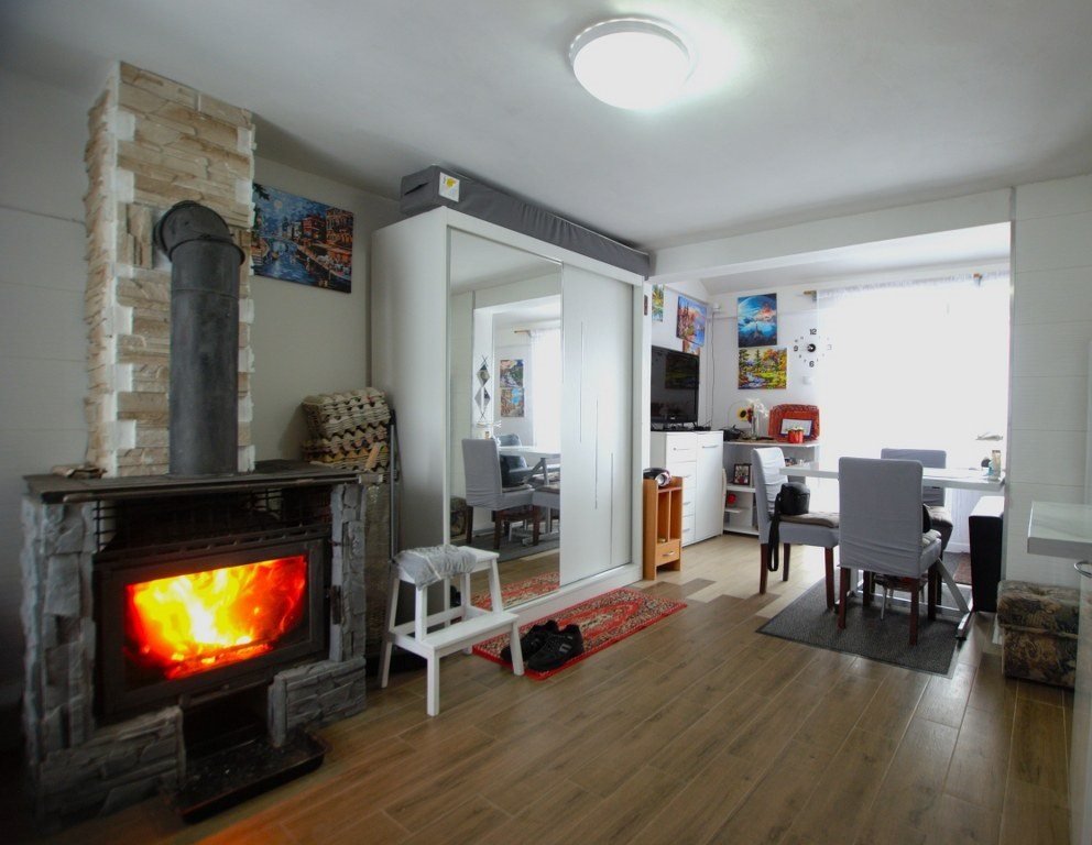 W skład domu wchodzi salon, łazienka z prysznicem, kuchnia oraz schowek na drewno. Budynek wybudowany z pustaka, pokryty blachą, ocieplany styropianem 10 cm oraz wełną mineralną. Ogrzewanie z kominka, ciepła woda z bojlera elektrycznego. Okna plastikowe. Ciepła woda ze studni głębinowej. Około 5 lat temu wykonano generalny remont, który objął m. in. wymianę instalacji.
