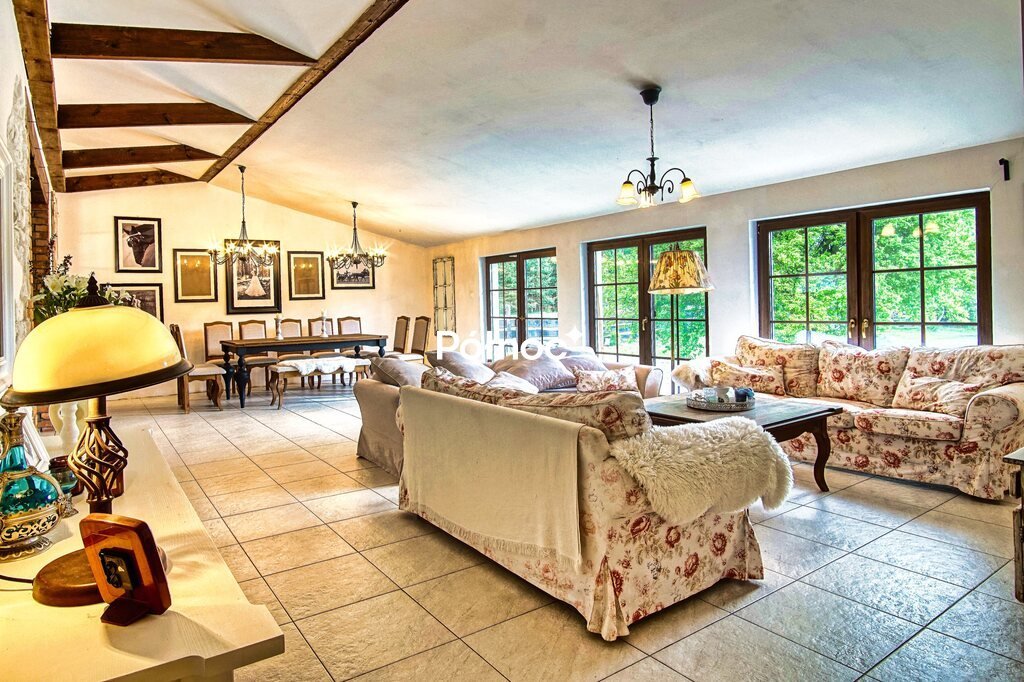 Główny dom (po rozbudowie i remoncie w 2024 r.) zachwyca przestrzenią i stylem nawiązującym do tradycyjnych polskich dworków: drewniane belki, rustykalna kuchnia, kominek, kamień na ścianach i panoramiczne przeszklenia z widokiem na las.