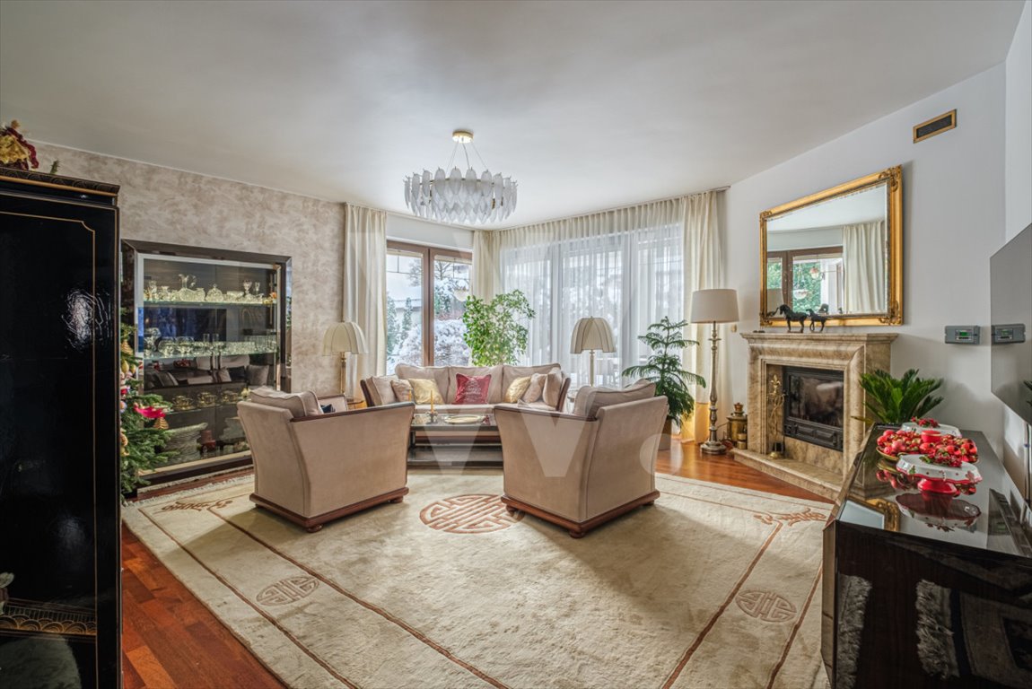 Sercem domu jest przestronny, jasny salon (33 m²) z marmurowym kominkiem z płaszczem wodnym.