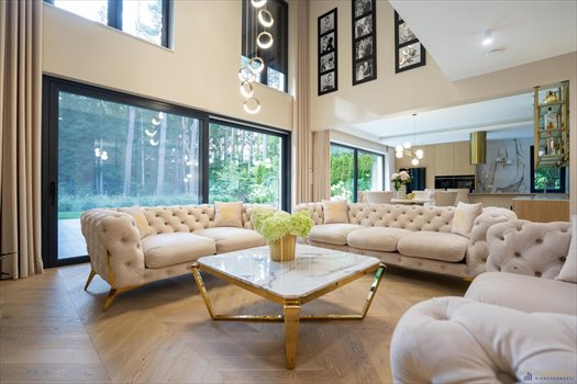 Założeniem architekta odpowiedzialnego za projekt wnętrz była aranżacja w ciepłych, przytulnych tonacjach z wykorzystaniem naturalnych materiałów wykończeniowych. W efekcie powstały ponadczasowe wnętrza urzekające spójnością. Otwarta przestrzeń parteru nie koliduje z uczuciem prywatności. Podłogi na parterze dębowe, na piętrze panel winylowy. Wyposażenie salonu to asortyment sklepu Primavera Home- luksusowe sofy, stół i krzesła w jadalni, hokery oraz stolik kawowy to indywidualny projekt architekta. Całe wyposażenie jest wliczone w cenę.