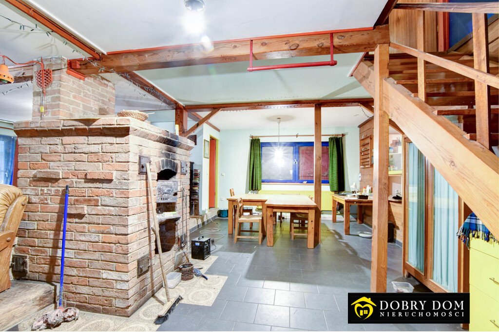przestronny salon (80 m²) z piecem fińskim z cegły (możliwość pieczenia chleba i przygotowywania przetworów),