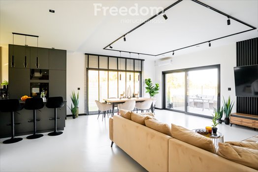 Cały dom wykończony jest w spójnym, nowoczesnym stylu – dominują jasne kolory, mikrocement i naturalne materiały. Wysokość pomieszczeń (2,9 m) dodaje przestronności, a systemy nowoczesnych instalacji – pompa ciepła, rekuperacja, klimatyzacja – gwarantują komfort i niskie koszty utrzymania przez cały rok. Garaż ogrzewany, z podłogą z żywicy, dopełnia całość.