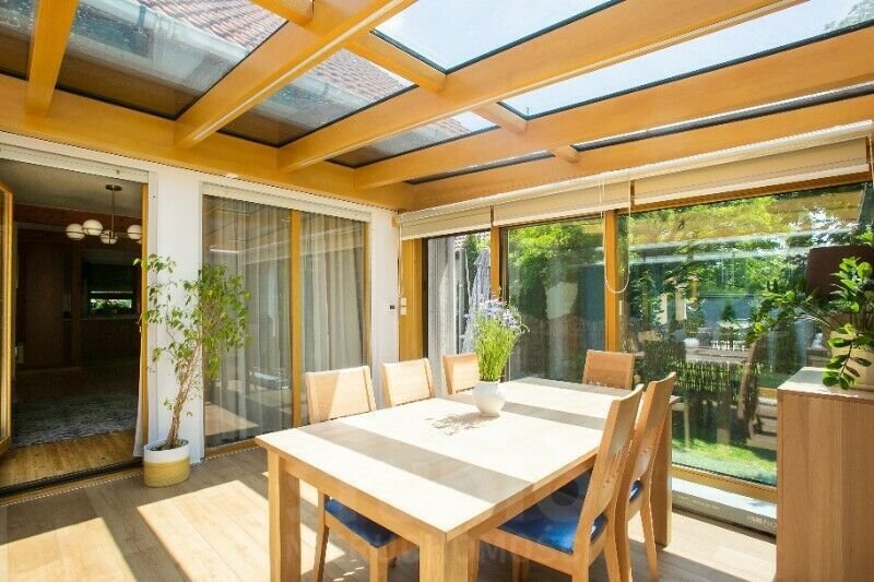 - ogród zimowy - o pow. 16 m2 - nowoczesne materiały, pełne szkoło, roleta dachowa elektryczna, całoroczny - ogrzewanie podłogowe.