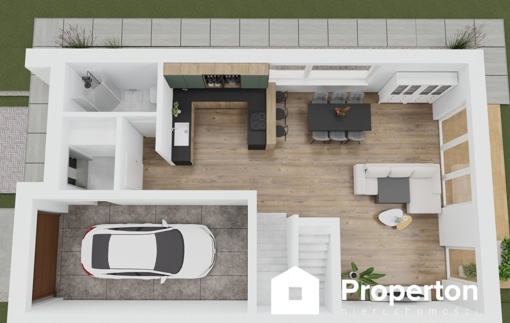 Ten dom w zabudowie bliźniaczej to połączenie modnej i nowoczesnej estetyki z komfortem wnętrz. Wygodna i funkcjonalna strefa dzienna oferuje domownikom idealne warunki do wspólnego spędzania czasu w salonie i spożywania rodzinnych posiłków w jadalni. Przestronne duże przeszklenia w salonie gwarantują idealne doświetlenie wnętrz, a przesuwne drzwi tarasowe przywołują na myśl luksus wypoczynku w ogrodzie. W obrębie otwartej przestrzeni dziennej wyodrębniono kuchnię, gdzie bez problemu zmieści się półwysep z barkiem śniadaniowym, a funkcjonalności kuchni potęguje przestrzeń wydzielona pod spiżarnię. Wygodę mieszkania zapewnia także wydzielona na parterze łazienka z miejscem na prysznic. Na poddaszu domownicy mają do dyspozycji cztery komfortowe sypialnie z dużym przeszkleniem, co gwarantuje optymalne doświetlenie wnętrz. Sypialnia główna wyposażona została w garderobę a w pozostałych pokojach przewidziana została przestrzeń na pojemne szafy. Na poddaszu przewidziano dodatkowe pomieszczenie gospodarcze, które służyć może jako pralnia. Łazienka z łatwością pomieści wannę wraz z prysznicem oraz inną potrzebną armaturę.