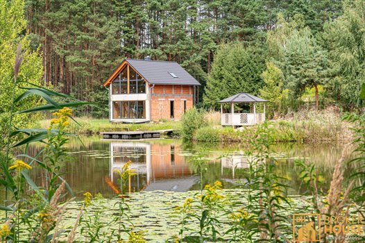 Dom w stanie surowym zamkniętym, wzniesiony w technologii tradycyjnej, murowanej (Porotherm), kryty dachówką ceramiczną. Widok z dużych przeszkleń domu na piękne rozlewisko. Ponadto domek narzędziowy, altana grillowa, murowana piwniczka.