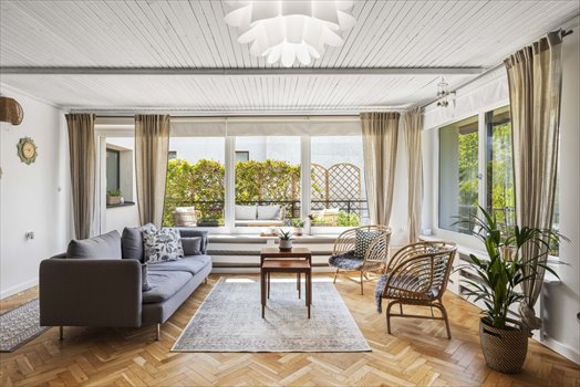 Kuchnia została wyposażona w kamienny blat, a jej fronty wykonano z frezowanego forniru dębowego, co nadaje jej naturalnego, nowoczesnego wyglądu. W salonie i jadalni uwagę przyciąga duży, egzotyczny stół, który doskonale komponuje się z drewnianymi stolikami kawowymi.