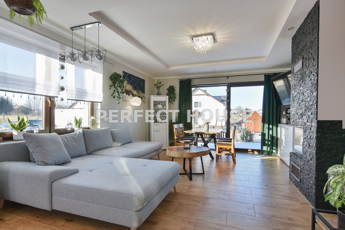 Unikalna architektura domu oferuje mnóstwo przestrzeni. Na uwagę zasługuje duży salon z kuchnią i kominkiem z rozprowadzeniem ciepła, który jest miejscem rodzinnych spotkań.