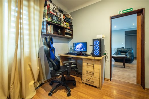 - Pokój z balkonem, który może pełnić funkcję gabinetu lub przestrzeni prywatnej.