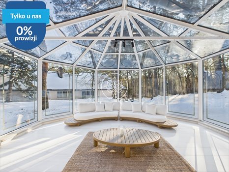 - wysoki na prawie 6 metrów salon z kominkiem i przeszklonym ogrodem zimowym