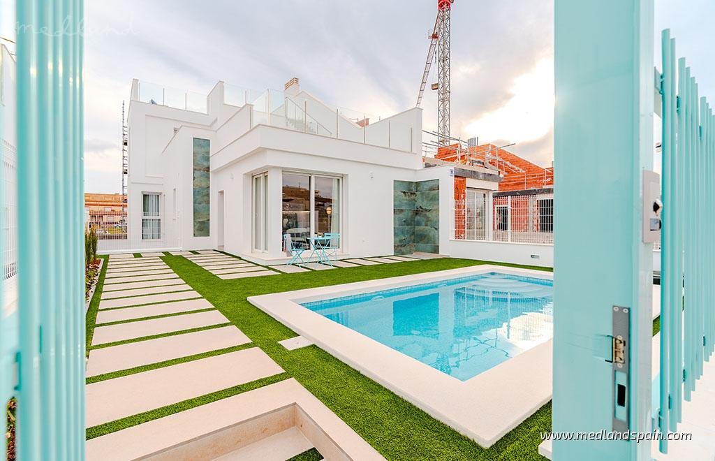 New villa project only 800m from the beach in Los Alcazares. An excellent location, very close to the La Serena Golf course, and the wide variety of daily amenities, like supermarkets, shops, bars and restaurants, banks, pharmacies, a medical centre, as well as the Dos Mares shopping centre. Outdoor sports enthusiasts have a wide choice of activities available besides golf, like hiking and mountain biking, cycling, scuba diving, and sailing. The good road network connects the area to other important tourist areas, like Cartagena and Murcia in 30-50 minutes respectively, and Alicante in just over an hour.Modern project of single-family homes, with 3 bedrooms and 3 bathrooms, distributed on two floors plus solarium and basement/garage, and available in semi-detached and detached models. All models present an open plan ground floor, combining the lounge, dining area and kitchen in a single space, with large windows that open onto a spacious terrace and pool area. There are 2 double bedrooms and 2 bathrooms (1 en-suite) on this floor too. The first floor is reserved for the master bedroom, with private bathroom, that opens onto a private terrace. The solarium can be reached from this terrace, where spectacular panoramic views can be enjoyed. The basement/garage, with motorised door, is a multipurpose space that can be used as required. The detached villas also include an English patio off the basement/garage, and a laundry room and separate storage room on the ground floor.The homes include ducted A/C, white goods, complete bathrooms with underfloor heating, fitted wardrobes, electric blinds, indoor and outdoor lighting, video intercom, private pool with outdoor shower, and landscaped garden.