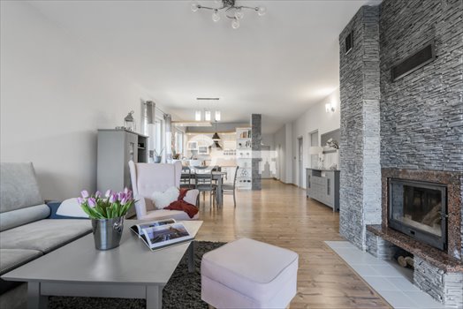 * Przestronny salon z kominkiem i otwartą kuchnią.