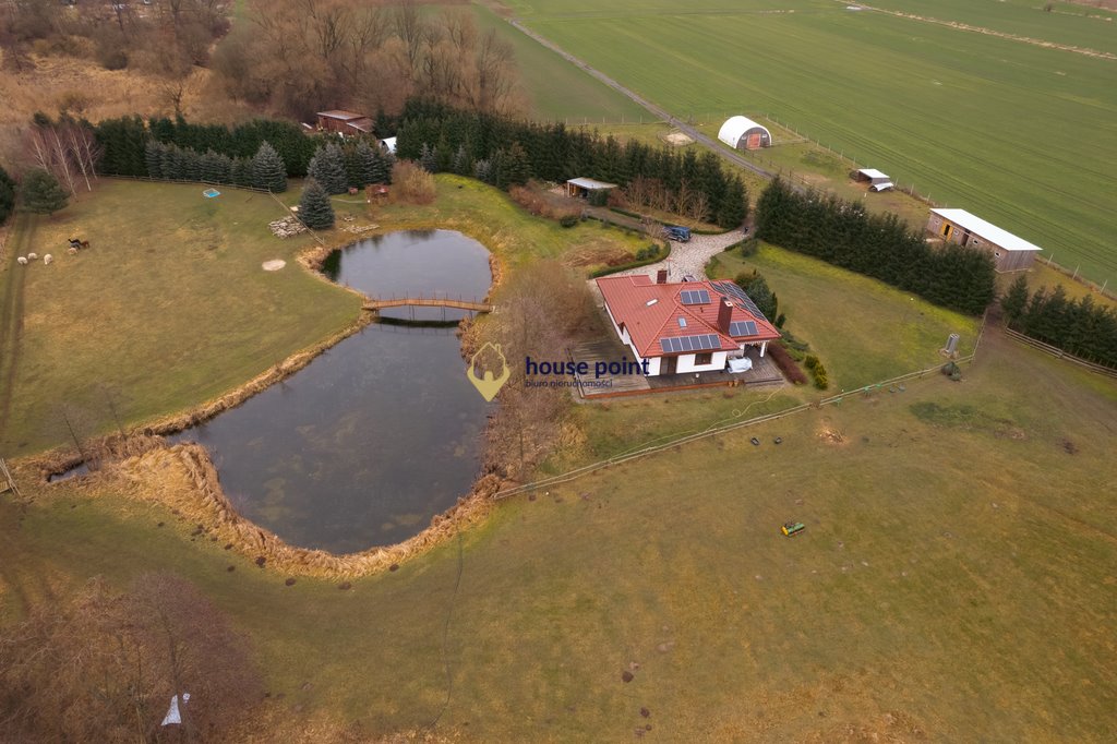 Dom ma powierzchnię użytkową 178,42 m2 i znajduje się na działce 2,4501 HA. Składa się z sypialni z dużą łązienką, gabinetu, pokoju gościnnego, 1 WC, salonu z kominkiem z wyjściem na taras, kuchni ze spiżarnią, Łazienka ze Strefą Komfortu (Sauna, jacuzzi), kotłowni, przedpokoju i przestronnego korytarza z wejściem na użytkowe otwarte poddasze z WC. Parter urządzony z wysokiej jakości materiałów. Na podłogach deska szarpana i gres. Kuchnia drewniana ze sprzętem AGD. Duża ilość okien zapewnia idealne doświetlenie nieruchomości i zielone widoki. Na dachu bardzo wydajna instalacja fotowoltaiczna wraz z pompą ciepła.