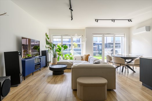 Nieruchomość zachowana w nowoczesnym stylu. Jasne ściany w połączeniu z beżem i czernią na meblach oraz jasnym brązem na podłogach sprawiają, iż wnętrze jest jasne, spójne i zachowuje swój przemyślany i elegancji styl w każdym z pomieszczeń. Salon wyposażony w wysokiej klasy meble.