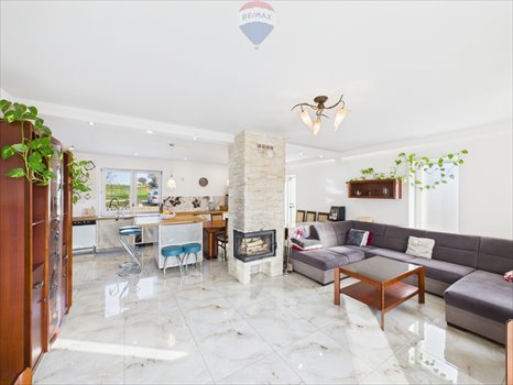 - jasny salon z kominkiem