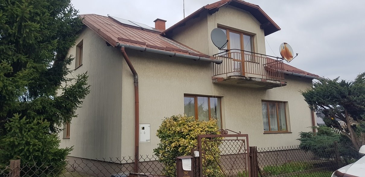 Dom wybudowany około 1965 roku. materiał murów - silikat, kryty blachą. Ocieplenie - ściany zewnętrzne - 8 cm styropianu. Strop drewniany z belek sosnowych. Od dołu deskowanie, mata trzcinowa i tynk. Od góry izolacja cieplna z wełny mineralnej między belkami.