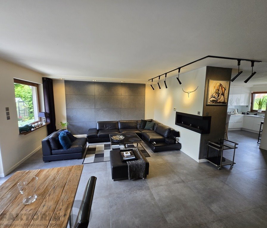 * salon 37 m2 z wyjściem na taras 15 m2 ('kamienny dywan') i ogródek; z tarasu wejście do oranżerii i większego garażu (łączna pow. 45 m2). W centrum salonu bio-kominek