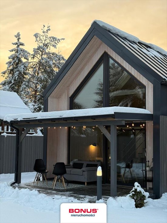 Wnętrze domu zostało zaprojektowane w stylu skandynawskim z nowoczesnymi akcentami, gdzie naturalne drewno łączy się z elegancką czernią dodatków. Sercem tej nowoczesnej stodoły jest wysoki salon z dużym przeszkleniem szczytowym, które wpuszcza mnóstwo światła i otwiera widok na ogród. Wykończenie jest spójne i przemyślane – ciemne schody, przesuwne drzwi oraz stylowe oświetlenie tworzą wyjątkowy, przytulny klimat. Łazienka o wyższym standardzie z nowoczesną kabiną prysznicową i ciemną armaturą wyróżnia tę ofertę na tle typowych domów letniskowych. Całość dopełniają praktyczne płytki na parterze oraz naturalne deski na antresoli, tworząc spójną przestrzeń.