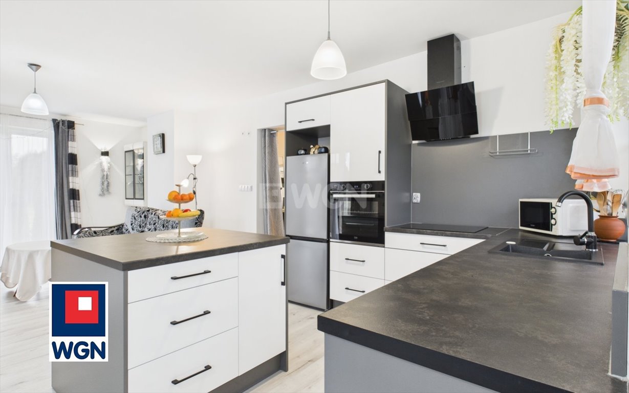 Wnętrza zaprojektowano z dbałością o wygodę domowników. Kuchnia wyposażona jest w zabudowę na wymiar z dużym blatem roboczym, a jasny salon oferuje aż dwa wyjścia na taras, co naturalnie łączy strefę dzienną z ogrodem. Dom zapewnia przytulny klimat, jednocześnie pozostając praktyczny w codziennym użytkowaniu.