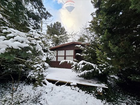 Obecnie działka jest zabudowana drewnianym domkiem 42m2: