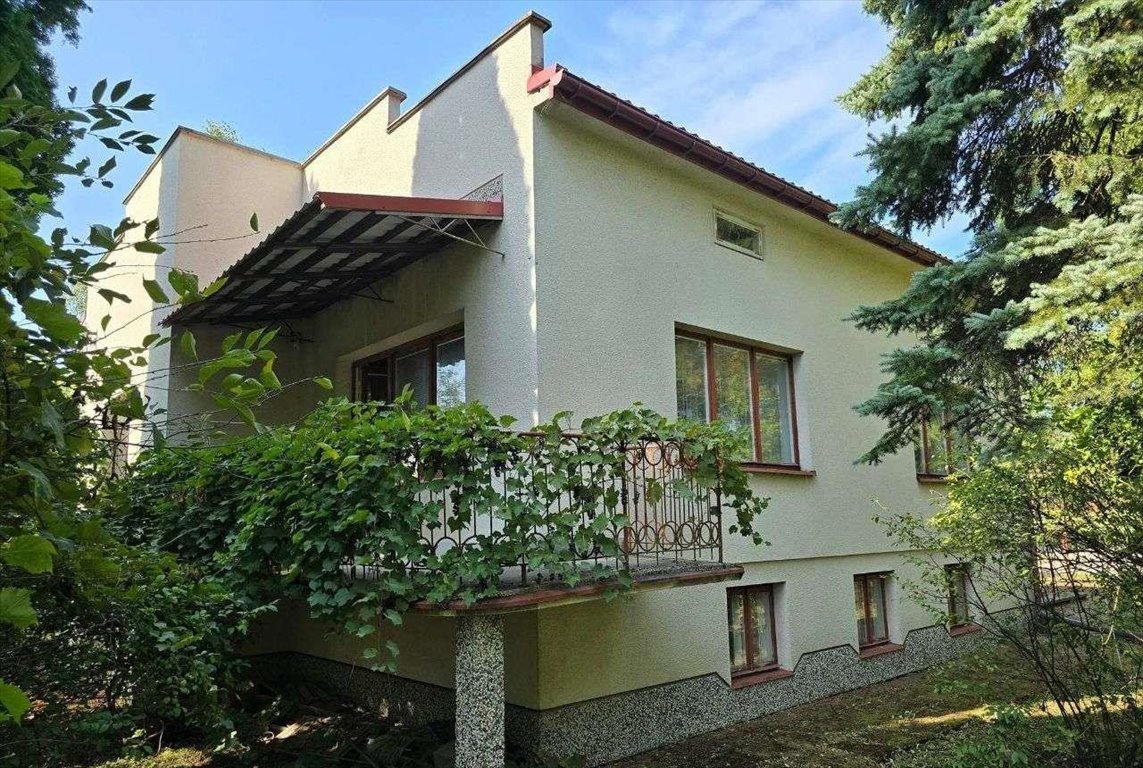 Teren ogrodzony, dom otoczony zielenią, liczne nasadzenia krzewów i drzew, w sąsiedztwie luźna zabudowa jednorodzinna.
