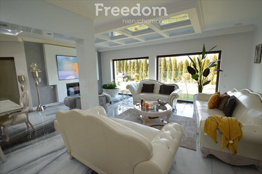 Dom tworzy piękny wystawny salon połączony z częścią jadalnianą oraz umeblowaną kuchnia z pełnym wyposażeniem AGD.