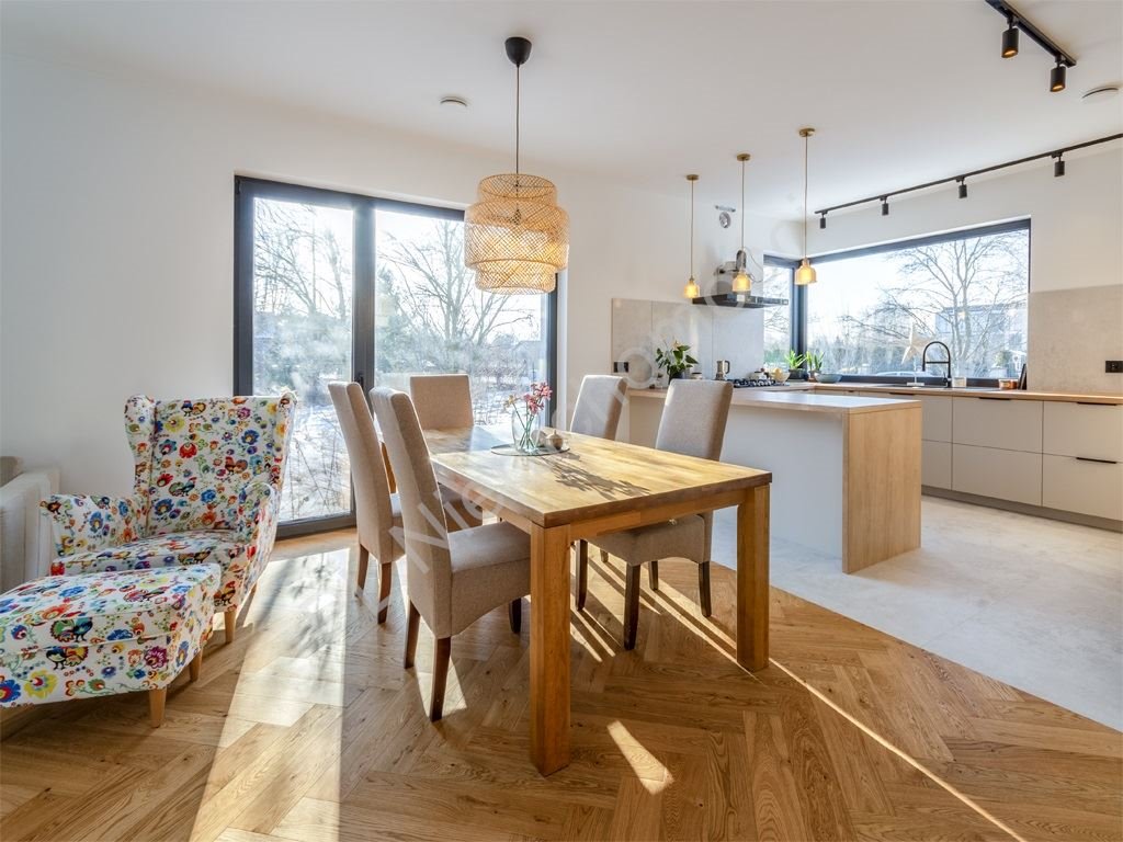 Na parterze sień wejściowa z garderobą, hol, pokój dzienny z jadalnią (34m2), aneks kuchenny (ok 12m2), spiżarnia, gabinet (15,5m2), pomieszczenie gospodarcze, łazienka z prysznicem, garaż jednostanowiskowy (23m2) z pomieszczeniem technicznym (8m2). Kuchnia umeblowana i wyposażona w sprzęt AGD. Podłogi wykonano z gresu oraz drewna dębowego typu warstwowego. Schody dębowe typu dywanowego. Pod schodami pomieszczenie magazynowe z wentylacją.