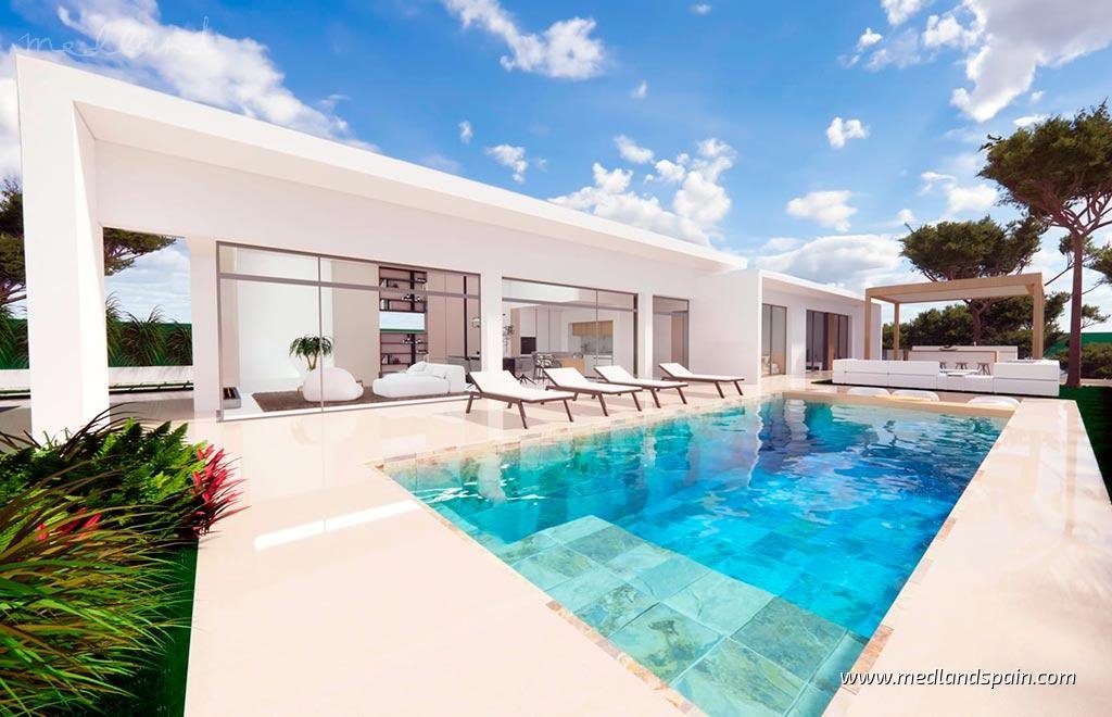Project of luxury villas in Pinar de Campoverde, an area surrounded by nature, belonging to the municipality of Pilar de la Horadada. The area has everything necessary for day-to-day living, and there are many outdoor activities available within a radius of 20 minutes’ drive, like two prestigious golf courses, the beautiful beaches of the Costa Blanca, as well as hiking and cycling trails in the Rio Seco Natural Park. The project is perfectly located, with an excellent road network that connects it with other tourist areas on the Costa Blanca and Costa Cálida. The Murcia airport can be reached in 40 minutes, and the Alicante airport in just over an hour.Exclusive villas on one level, with 3 bedrooms and 2 bathrooms, built on plots over 800m2. The villa presents a large, open plan living area, combining a modern kitchen with a breakfast bar, dining area and lounge. The floor-to-ceiling windows in the lounge open onto the terrace with an impressive 10x3,5 pool. The master bedroom has a private dressing area and bathroom, and the remaining 2 bedrooms share a bathroom. All bedrooms open onto the terrace and chill-out area, which includes an outdoor kitchen and dining area, perfect for enjoying an al-fresco meal.There is also a small, multipurpose basement of 48m2 can be accessed from the driveway/parking area, and can be converted into a home office, a gym, or any other necessity. The driveway has space for 2 parked cars and has pre-installation for a charging station for electric cars.The villas are built with top quality materials and include pre-installation for ducted A/C with Airzones, integrated white goods in the kitchen, electric blinds in the bedrooms, pre-installation for solar panels, private garden with various water points, private parking on the premises with a motorised gate. Depending on the stage of construction, it is possible to customise the finishes from a choice of materials.