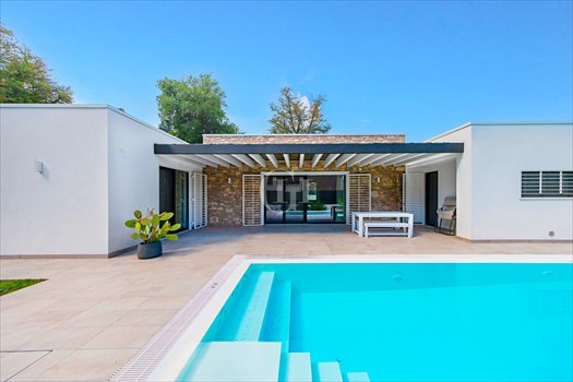 Willa została zaprojektowana w całości na jednym piętrze na działce o powierzchni około 900 metrów kwadratowych i została zaprojektowana w wyrafinowanym nowoczesnym stylu śródziemnomorskim, w którym przestrzenie zewnętrzne harmonijnie współgrają z wnętrzami dzięki dużym przesuwanym oknom, które gwarantują jasność, otwartość i ciągłość wizualną.