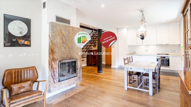 - obszerna przestrzeń kuchenna z zabudową po sufit i wyjściem na duży, drewniany, naturalny taras (bankier, 25 mkw) oraz kominek (z rozprowadzeniem ciepła do pomieszczeń na piętrze). W kuchni do dyspozycji użytkowników zmywarka, lodówko-zamrażarka, piekarnik, płyta gazowa (sprzęt marek Miele, AEG), na podłodze śliczny łupek.