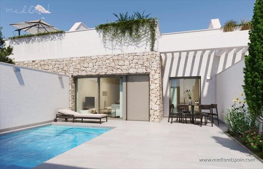 Located in Pilar de la Horadada, these attractive terraced villas offer a stylish blend of Mediterranean tradition and contemporary comfort, just minutes from the town centre and all essential services. With the beach only 3.5 km away, and both Murcia and Alicante airports within easy reach, the area is ideal for holidays or year-round living. Several golf courses, marinas, international schools and supermarkets are just a short drive away, as well as municipal sports facilities, and a medical centre, all contributing to a relaxed coastal lifestyle.The development includes terraced villas on one level, designed with a focus on convenience, privacy, and natural light. Buyers can choose between models with 2 or 3 bedrooms and 2 bathrooms. The living space is open plan, with a modern kitchen and lounge area that opens directly onto the terrace area through large sliding windows. All homes include a rooftop solarium, ideal for sunbathing, entertaining, or enjoying the mild Mediterranean evenings.Each property features a private plot, on-site parking and a spacious rooftop terrace. Homes come with a fully fitted kitchen with white goods, underfloor heating in the bathrooms, electric blinds, and pre-installation for air conditioning. Depending on the stage of construction, buyers can customise finishes from a range of materials and opt for extra upgrades such as a private pool or a summer kitchen on the solarium, for an additional price.The combination of style, practicality and an excellent location makes these villas a smart choice for international buyers looking for comfort, convenience and lifestyle on the Costa Blanca.