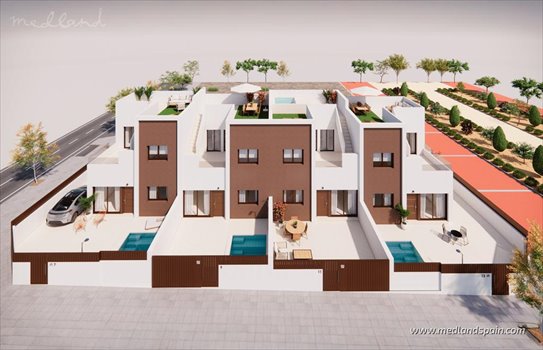 Located in the charming town of Pilar de la Horadada on the Costa Blanca, this exclusive project offers the perfect mix of tranquility and easy access to everything. Just minutes from pristine beaches, golf courses, marinas, and natural parks, the area is ideal for outdoor enthusiasts. Enjoy a rich selection of restaurants, shops, and local markets year-round. The convenient road network connects to Murcia airport in just 35 minutes and less than an hour from Alicante Airport, with Torrevieja and Cartagena each within a 30-minute drive.This exclusive project presents four beautifully designed terraced villas, each with 3 bedrooms, 2 bathrooms, a private garden, and a spacious rooftop solarium with pre-installation for a summer kitchen. The homes are distributed over two floors plus the solarium. The ground floor includes an open-plan living area with a modern kitchen, a bedroom, and a bathroom. The 2 remaining bedrooms, and a shared bathroom, are on the first floor, with a spacious terrace that leads to the solarium. For those who need extra outdoor space, there are corner plots available too. The homes are finished with premium materials, and feature pre-installation for ducted A/C, fitted wardrobes, underfloor heating in the bathrooms, and parking on the premises with pre-installation for a motorized gate. Depending on the stage of construction, and for an additional cost, it is possible to add a private pool, installing a jacuzzi and/or an extra en-suite bedroom on the solarium.A prime Mediterranean location, close to the beach and all amenities, with easy access to two airports, these contemporary homes are an ideal investment as a holiday home or for year-round living.