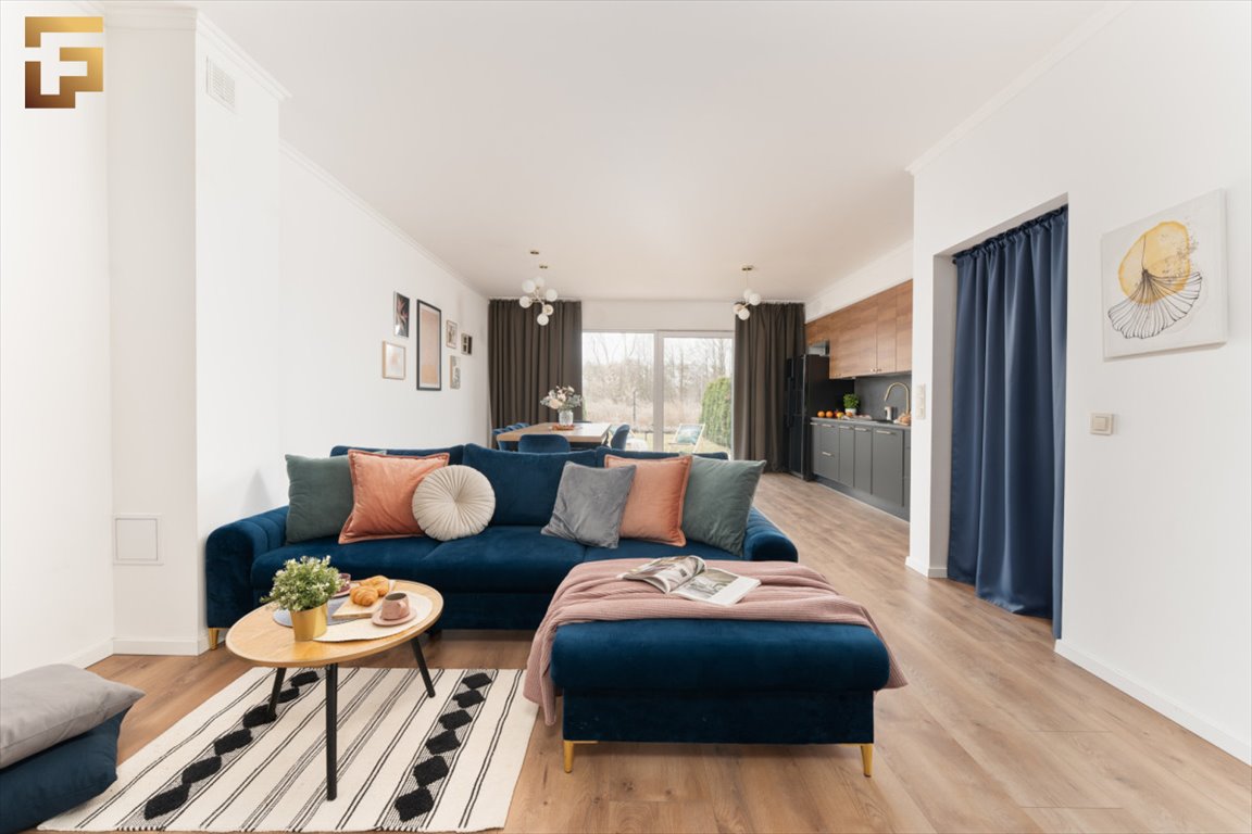 Z salonu prowadzi wyjście na ogród przez duże przeszklenia typu HS, które zapewniają dobre doświetlenie wnętrza. Ogródek o powierzchni około 60 m² wychodzi na otwartą przestrzeń zieloną - brak zabudowy po tej stronie gwarantuje prywatność i widok na naturę, gdzie często można spotkać dziką zwierzynę. To miejsce szczególnie docenią osoby posiadające zwierzęta lub szukające spokojnego otoczenia.