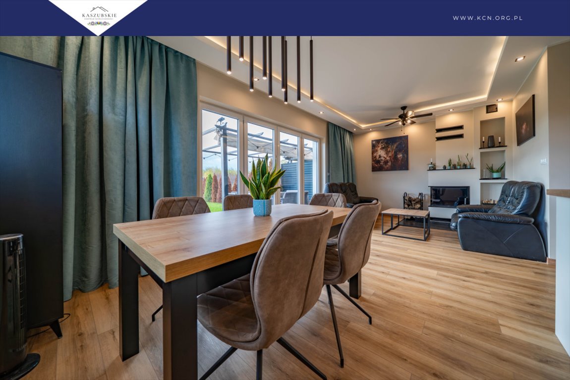 Jasny salon z kominkiem połączony z jadalnią, nowoczesna kuchnia z pełnym AGD, łazienka, pomieszczenie gospodarcze oraz zadaszony taras z meblami ogrodowymi.