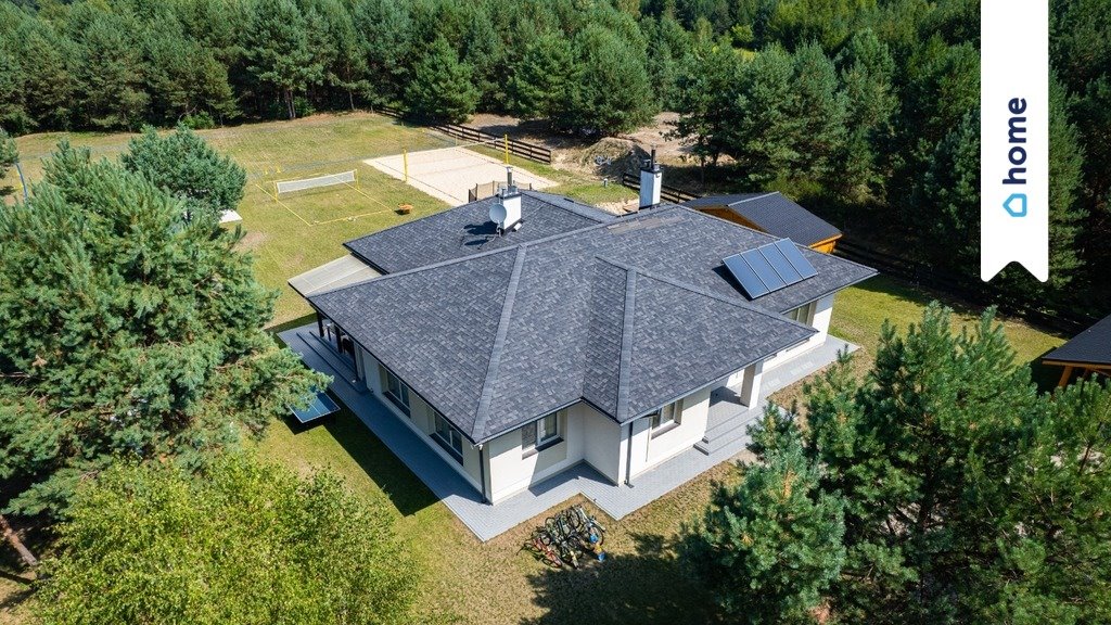 Nieruchomość skierowana jest do osób ceniących sobie wysoką jakość wykończenia, przestronne jasne wnętrza oraz nietuzinkową lokalizację. Dom został wyposażony w nowoczesne i energooszczędne rozwiązania takie jak solary do ogrzewania wody, piec na biomasę lub ekogroszek, ogrzewanie podłogowe oraz posiada własną oczyszczalnie ścieków. Zdecydowanie sercem domu jest super komfortowy salon połączony z aneksem kuchennym. Z salonu można wejść bezpośrednio na taras oraz posesję na której znajduje się basen, boisko do gry w siatkówkę, koszykówkę oraz boisko do piłki nożnej. Pozostała część domu składa się z czterech oddzielnych sypialni, dwóch łazienek, garderoby oraz pomieszczenia gospodarczego. Właściciel przed domem wybudował wiatę z miejscem postojowym na dwa samochody a za domem pomyślał również o budynku gospodarczym do przechowywania narzędzi.