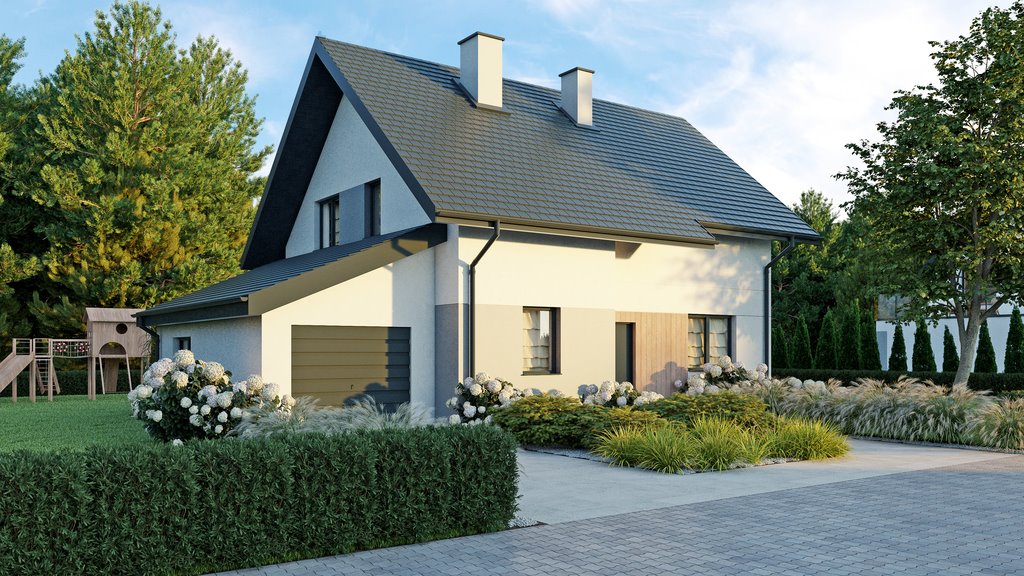 Dom o powierzchni 138.11 m² z garażem w bryle budynku nad którym znajduje się przestronny taras oraz dużą ponad 8 arową działką z przestrzenią na ogród.