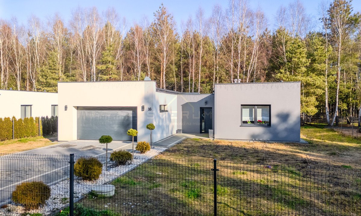 Dom wybudowany w 2022 roku wyróżnia się nowoczesną, minimalistyczną bryłą z płaskim dachem oraz dużymi przeszkleniami, które doskonale doświetlają wnętrza i otwierają je na zielone otoczenie.