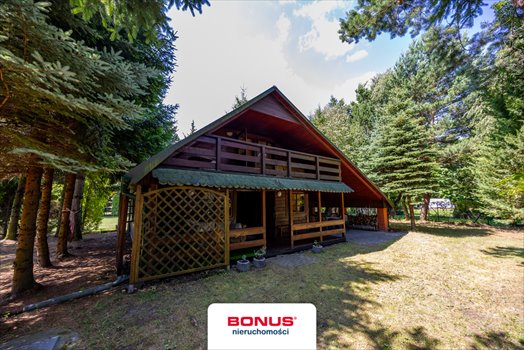 Przed domkiem znajduje się zadaszony taras i wiata, która może służyć jako miejsce na grilla czy drewutnia.