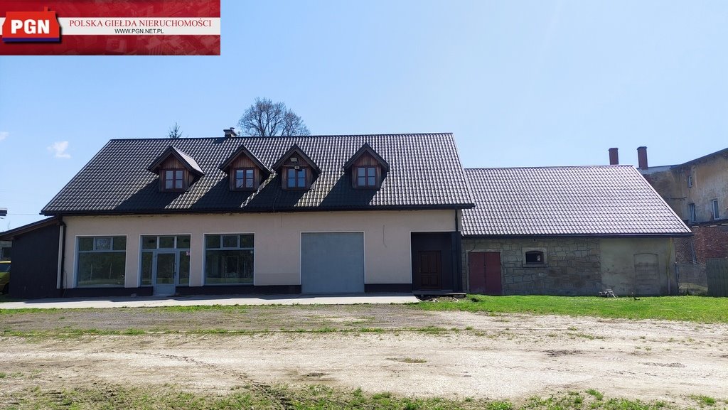 Parter budynku przewidziany pod działalność gospodarczą: garaż/hala z wysoką elektryczną bramą wjazdową, pomieszczenia z witrynami(sklep, biura) oraz zaplecze (kotłownia, magazyn, pom. socjalne, łazienka). Na piętrze komfortowe, przestronne (100 m2) mieszkanie (dwie oddzielne duże sypialnie, korytarz, łazienka, dodatkowe pomieszczenie(pralnia), salon z kuchnią i jadalną, klatka schodowa, spiżarnia). Dach kryty blachodachówką, na dachu baterie solarne na ciepłą wodę, budynek ogrzewany piecem stałopalnym, w kominie wkład kwasoodporny. Studnia głębinowa, własna oczyszczalnia ścieków (bezobsługowa, rozsączająca).