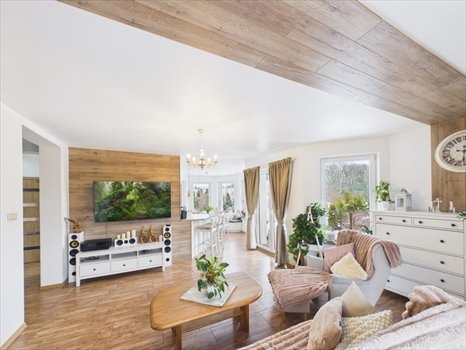 Na parterze ogrzewanie podłogowe, na poddaszu kaloryfery. Ogrzewanie w domu zasilane z pieca na pellet z podajnikiem wraz z możliwością sterowania z telefonu. Ciepła woda z bojlera elektrycznego, na posesji Instalacja fotowoltaiczna (na starych zasadach). Drzwi wejściowe do domu drewniane z lustrem weneckim, schody prowadzące na poddasze dębowe, Okna PCV dwuszybowe dwukolorowe, dach ocieplony wełną o gr.25cm - podbitka drewniana, na poddaszu ściany w gładzi, na podłogach deska barlinecka, oraz panele.