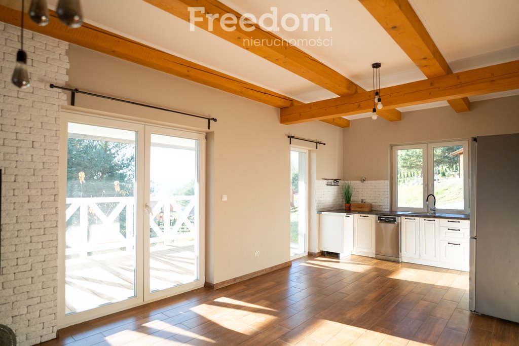 Wnętrze domu zaprojektowano w stylu mazurskim, z drewnianymi belkami w salonie, które tworzą ciepły, przytulny klimat. Z salonu prowadzi wyjście na słoneczny taras o powierzchni 13,8 m², z którego rozpościera się przepiękny widok na otaczające pola i lasy. Dom położony jest na lekkim wzniesieniu, co zapewnia niepowtarzalną panoramę okolicy oraz doskonałe nasłonecznienie.