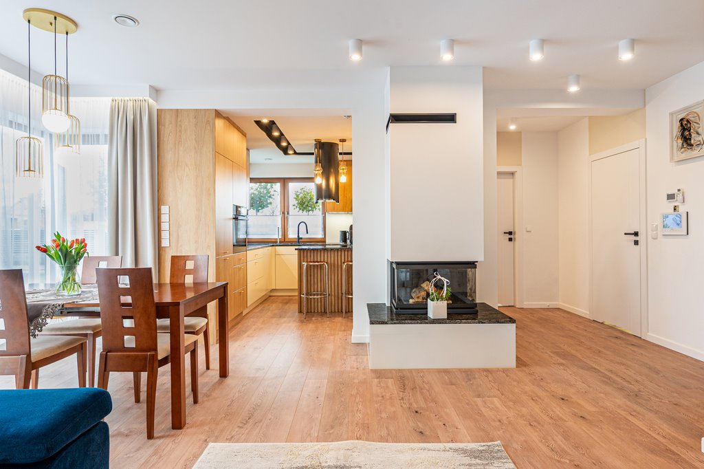 Szereg udogodnień, takich jak antywłamaniowe rolety zewnętrzne, alarm, monitoring, ogrzewanie podłogowe na całej powierzchni domu z możliwością regulacji w dwunastu strefach, kominek, system rekuperacji, wideodomofon, dwustanowiskowy garaż z dodatkowym miejscem na rowery sprawiają, że przyszli właściciele zamieszkają w wygodnym do życia i bezpiecznym miejscu.