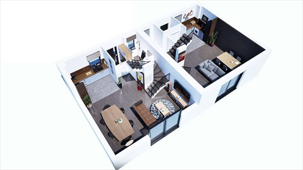 Piętrowy dom o powierzchni 83m2 usytuowany na ponad 2 arowej działce. Inwestycja składa się z salonu z otwartą kuchnią trzech sypialni , WC, łazienki oraz strychu.