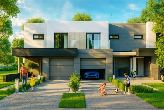 Nowatorski projekt domu w zabudowie szeregowej idealny dla osób poszukujących funkcjonalnej przestrzeni z nowoczesnym designem. Budynek charakteryzuje się prostą, ale elegancką bryłą, z płaskim dachem, co zapewnia przestronność wnętrz oraz brak skosów na piętrze, ułatwiając aranżację przestrzeni.