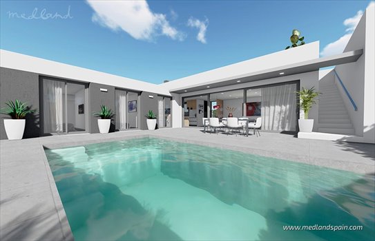 New villa project, only 450m from the wonderful beaches of San Juan de los Terreros, on the Almeria Coast. The area offers a selection of services and amenities, like supermarkets, shops, bars and restaurants, banks, and pharmacies. The beautiful, natural environment is ideal for nature lovers, and those looking for a peaceful area to relax and enjoy some outdoor activities like hiking, golf, as well as water sports like sailing and diving. The excellent road network connects the area with the cities of Almeria, Cartagena, and Murcia in just over an hour.The project presents homes on one level plus a solarium, available in two models: terraced villas with 2 bedrooms and 2 bathrooms, and detached villas with 3 bedrooms and 2 bathrooms. All models have an open plan lounge, dining area and kitchen, with large windows that open onto the terrace and pool area. The external stairs lead to the solarium where the panorama views can be enjoyed. The terraced villas have a private patio off the bedrooms and space for one car, while the detached villas have a private garden and space for two cars.The finishes of the villas can be personalised from a choice materials. On delivery the villas will include pre-installation for ducted A/C, white goods, electric blinds, summer kitchen on the solarium, private pool with outdoor shower, pre-installation for solar panels, and parking on the premises.