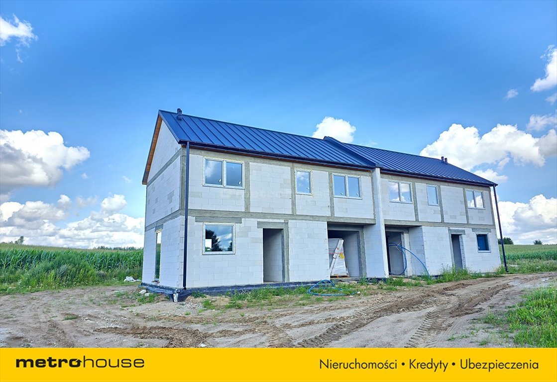 elewacja, dachówka ceramiczna, okna, drzwi i brama garażowa, ogrodzenie panelowe, podjazd z kostki, zasiany trawnik, ocieplone poddasze pianą PUR, wykonane ściany działowe, doprowadzone media (prąd, woda, kanalizacja przydomowa oczyszczalnia w cenie).