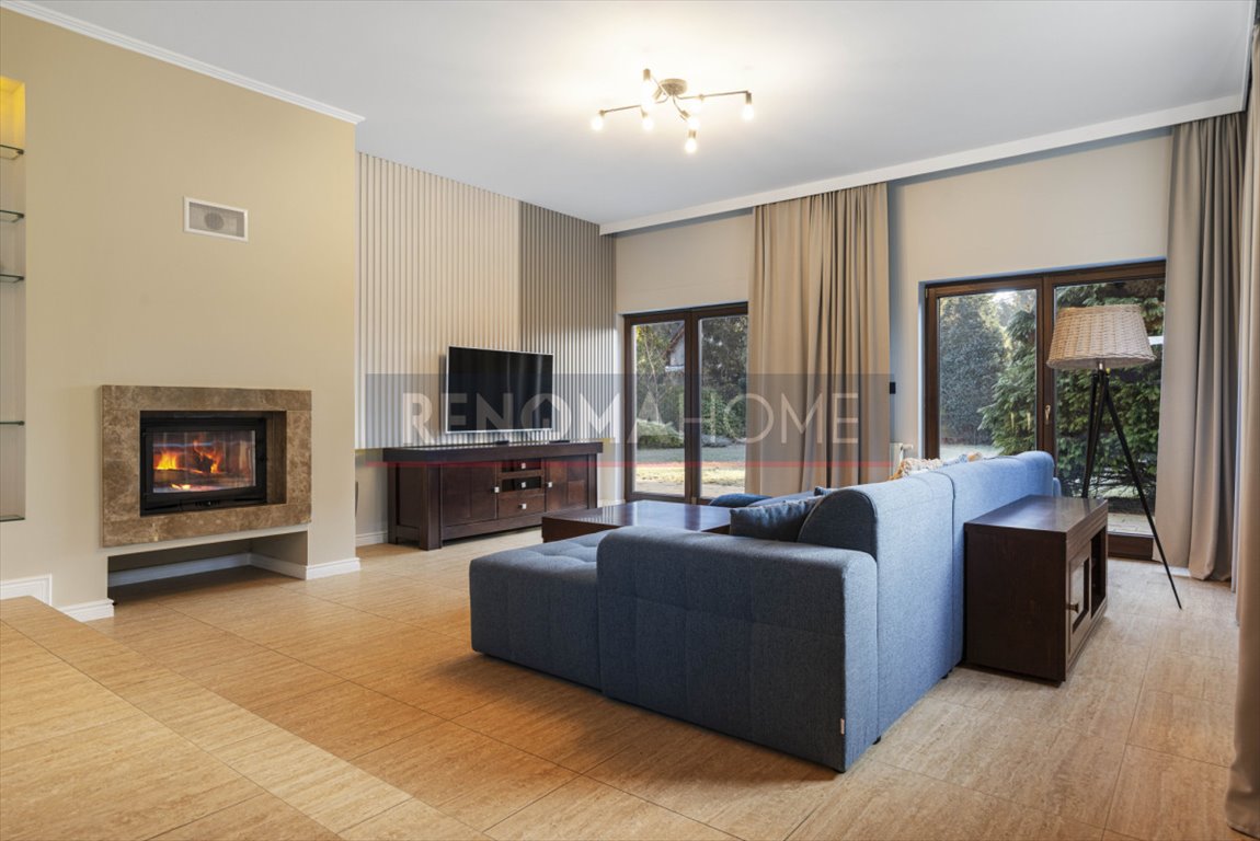 - przestronny salon z kominkiem i widokiem na ogród