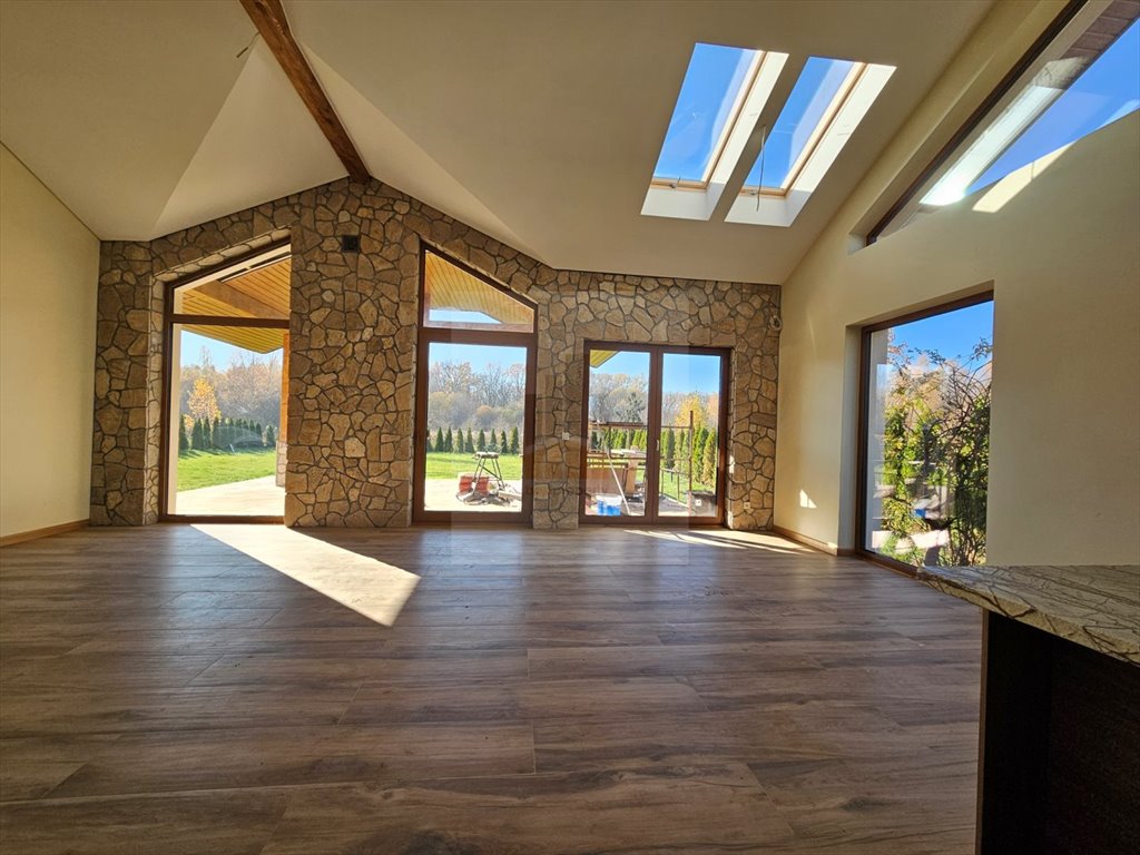 Zupełnie nowy dom, w trakcie wykańczania. Wysoki salon z dużym oknem z widokiem na zadbany ogród.