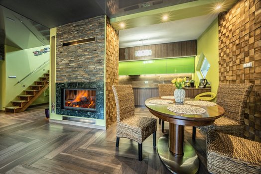 ✔ Przestronny salon z dużym kominkiem – idealny na wspólne wieczory